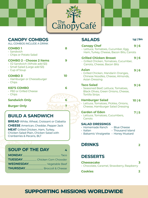 The Canopy Café is the perfect place to grab a delicious cup of coffee and a healthy lunch. We are open Monday - Thursday from 10:30 am to 2 pm. Catering is also provided for large parties.