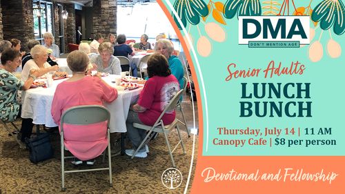 Join our Senior Adults on the second Thursday of each month for lunch, a devotional and fellowsip. Its at 11:00 in the Canopy Cafe in our Atrium.